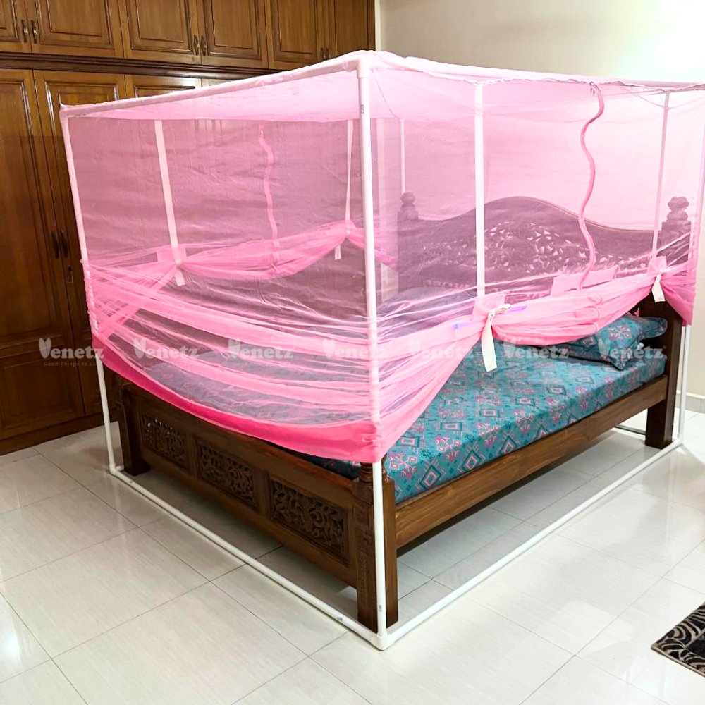 "Venetz Mosquito net comes with a frame and net. It works very well. Peaceful sleep as promised. Worth the money. I recommend it for a healthy way to prevent mosquito bites. They even do custom sizes!"