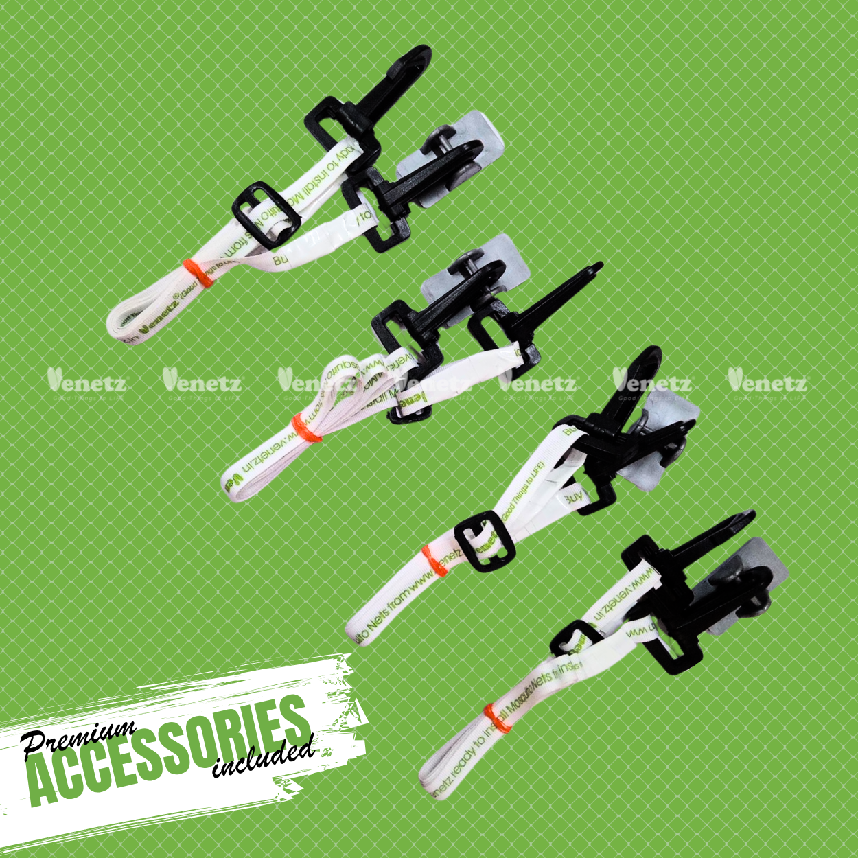 Unfold the net and attach the heavy-duty grip hooks — fix once, lasts long. Stick and hang it on the ceiling or wall using the premium accessories included. Secure the elastic bands around your bed for a snug, perfect fit. Available in single, double, and triple sizes (based on requirement, customization is also available). Removable, machine washable, and ready in just 30 seconds — only with Venetz.
